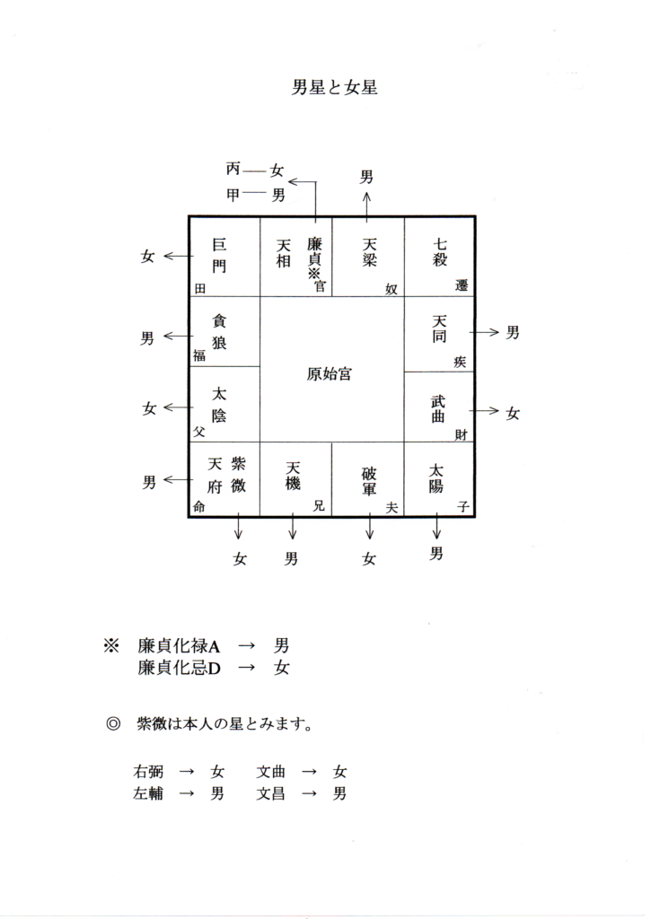 尚、廉貞星だけは、付く四化星により男星・女星とが分かれます。
