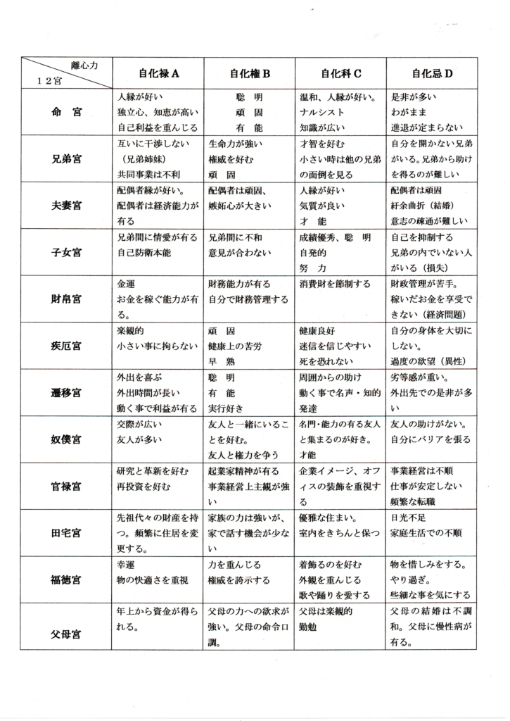 各宮に生年の四化が同宮している場合、又は串聯(れん)がある場合には、同宮している生年四化(串聯している四化)により、現象(意味)が変わる事があります。